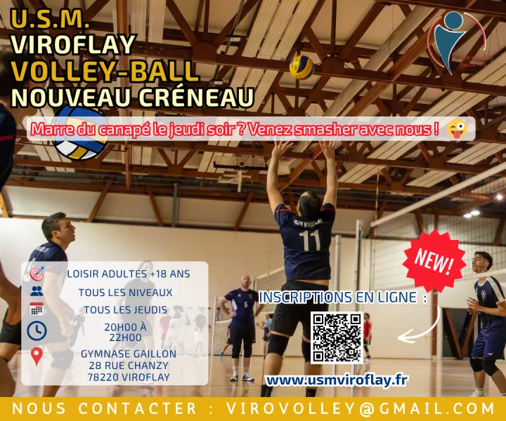 Publié le 20 Mars 2026La section Volley-Ball de l'USMV est heureuse de vous informer de l'ouverture d'un nouveau créneau loisir le jeudi de 20h à 22h !