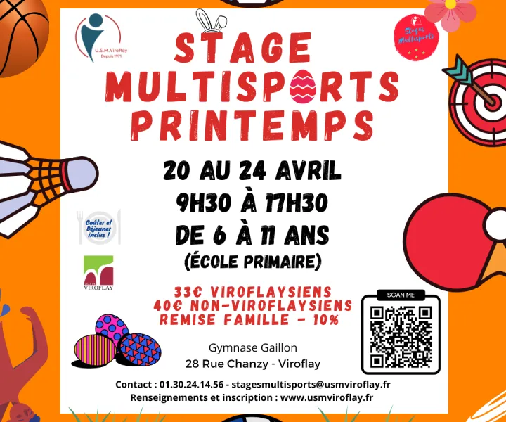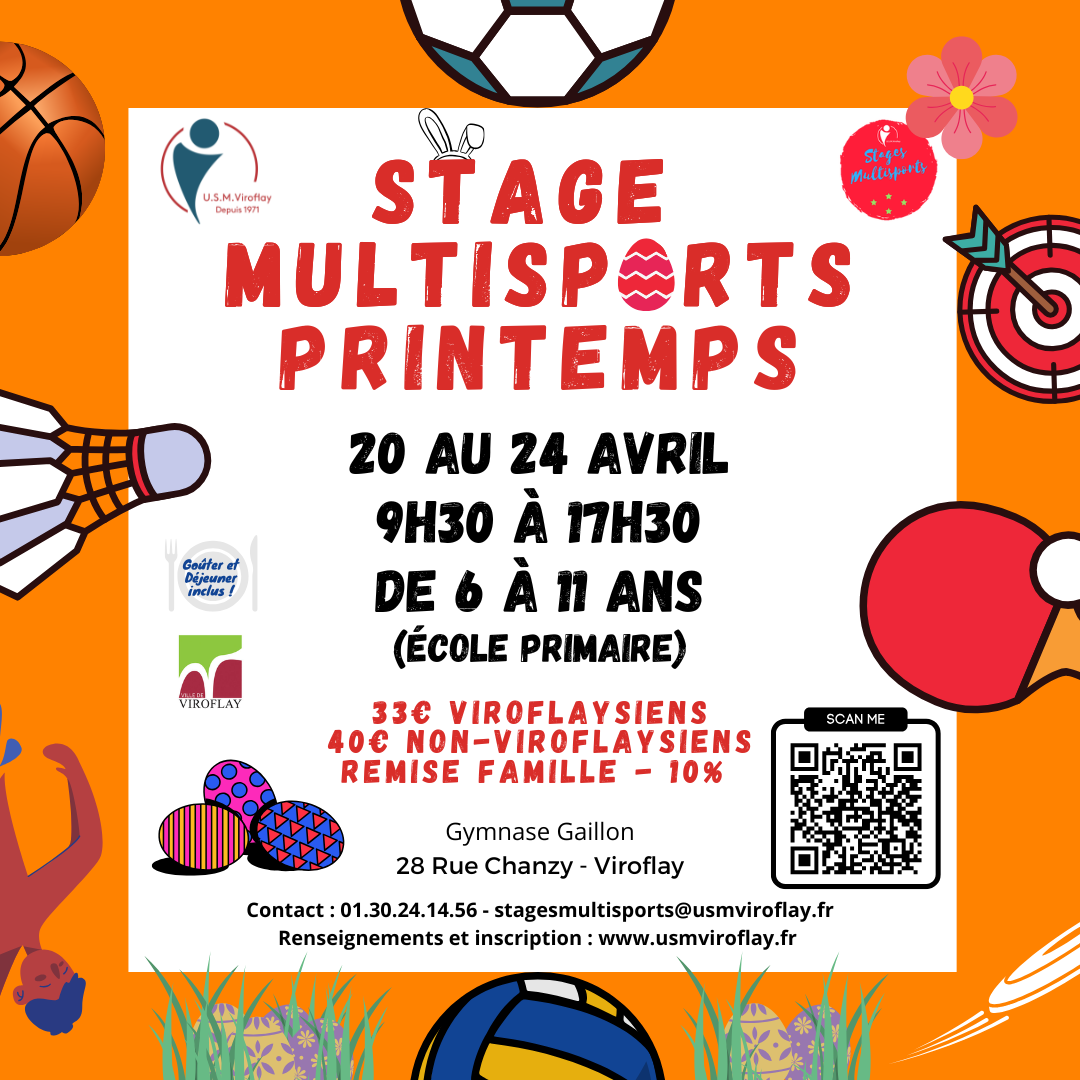 Publié le 28 Fev. 2026L’Union Sportive Multiactivité de Viroflay organise un stage multisport durant les vacances de printemps, au Gymnase Gaillon, du lundi 20 au vendredi 24 avril.